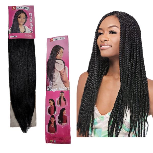 abuja-maxi Abuja Maxi braid is made of premium fiber. They have a soft, silky texture, and are lightweight. The braid is made of premium fiber and can be used to achieve any style from box braids, twist or even cornrows of whichever size you want.